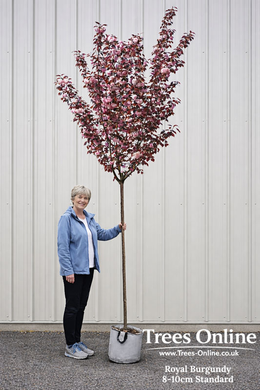 We supply mature, large and established Royal Burgundy cherry trees for instant impact, saving you years of waiting for a full-sized cherry blossom tree. Our stock includes standard, half-standard and multi-stem Japanese flowering cherry trees in a choice of heights and girths, suitable for small DIY projects through to council planting schemes. Every Prunus Royal Burgundy cherry tree we sell is sourced from UK suppliers and available to buy online with nationwide delivery.