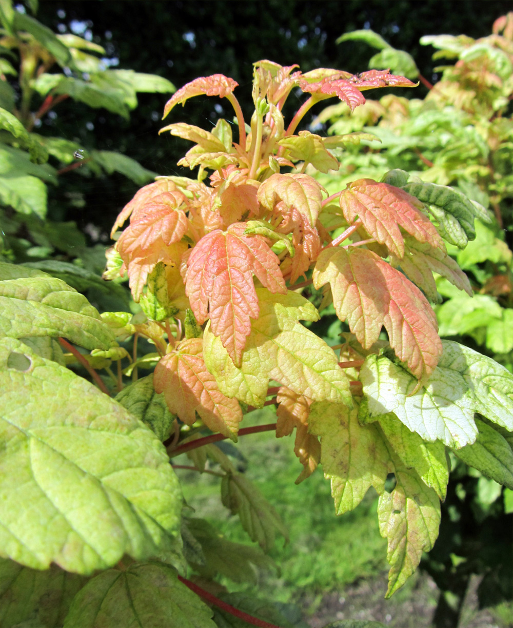 Prinz Handjery (Acer pseudoplatanus 'Prinz Handjery') is another beautiful sycamore maple we had to include in our maple collection. Prinz Handjery, is at its most dramatic in spring, when its young foliage an intense, almost glowing pink colour. It carries long-dripping yellow flowers. A somewhat slow- growing, compact headed tree, this tree is a good choice for a small garden where its height of 7m (23ft 4in) is not going to overwhelm.