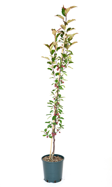 Red Obelisk (Malus 'Red Obelisk') was first introduced in Belgium. A nice, compact upright tree with pink buds opening white and followed by attractive, conical, red fruits. Foliage is purplish-brown at first, later becoming dark green. Red Obelisk apples are good for crab apple jelly.