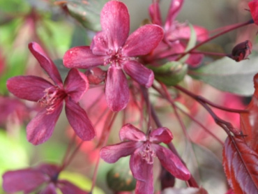 An extremely attractive small crab apple tree, Royal Beauty (Malus 'Royal Beauty') is distinguished by its slender, hanging, reddish stems of bronze-purple foliage. In May its purple-red to deep pink flowers are a real show, this is followed in Autumn by dark red crab apples which are then followed by bronzed yellow leaves. The crab apples last well into the winter which should keep the birds coming back to your garden. Super glue on the branches or peanuts on a string are other ways of keeping birds in your garden but then you may have a few visits from various government organisations about this.